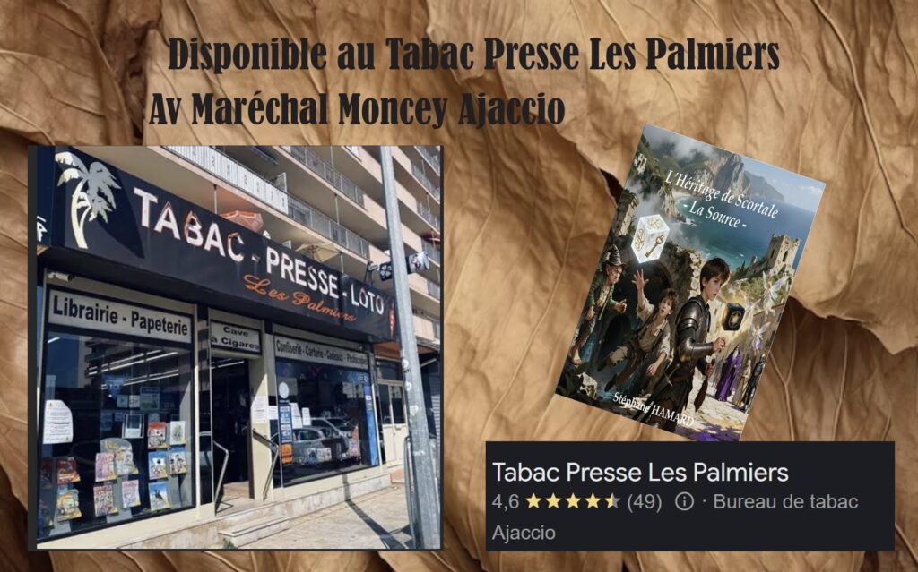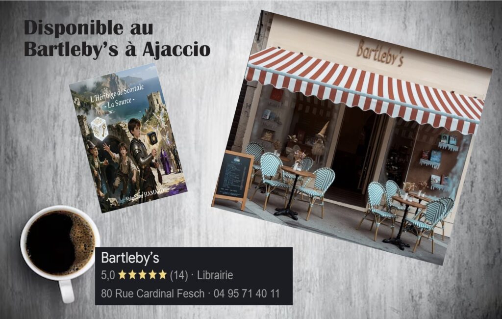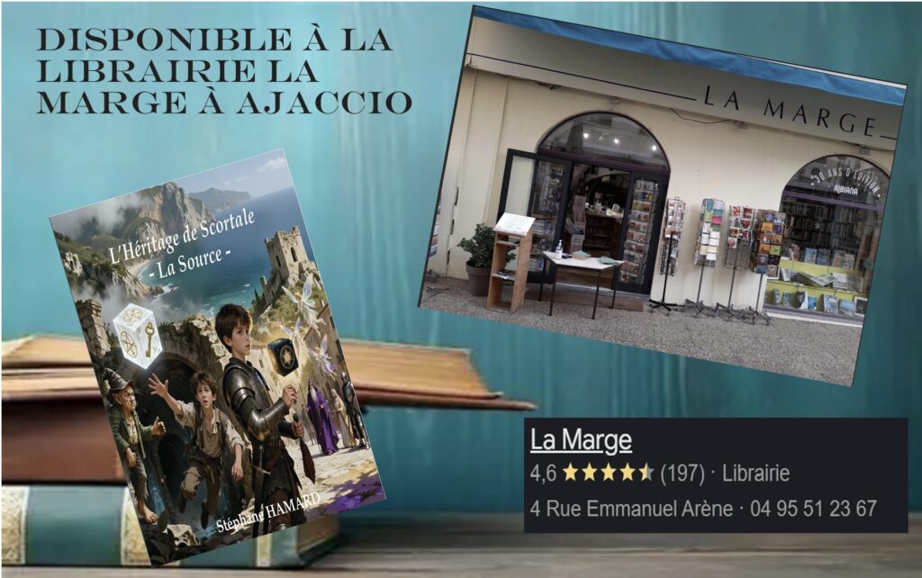 Oyé les amis que vous soyez lectrices, lecteurs, ou que vous ayez dans votre entourage des âmes qui aiment voyager à travers les livres, je suis heureux de vous annoncer que mon roman : « L’Héritage de Scortale – La source », en plus d’être sur Amazon et Kobo, est désormais disponible sur Ajaccio à la Librairie La Marge, au café littéraire Bartleby’s ainsi qu’au Tabac Presse Les Palmiers.
