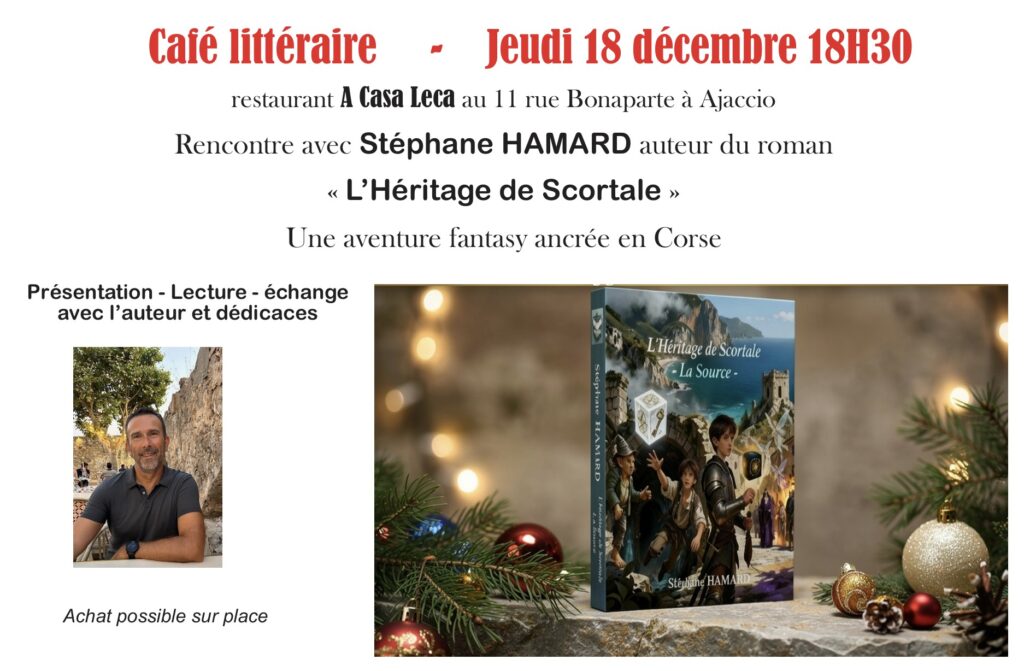 Jeudi 18 décembre, je me suis lancé dans le bain. J’ai présenté, pour la première fois en public, mon roman “L’héritage de Scortale – La source”. Et je tiens à remercier toutes les personnes présentes. Merci pour leur écoute et leur participation. Une belle soirée d’échange du café littéraire au restaurant À Casa Leca à Ajaccio